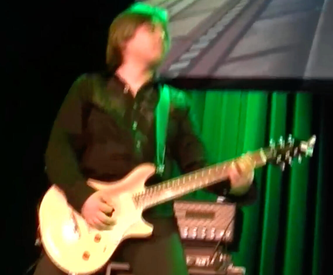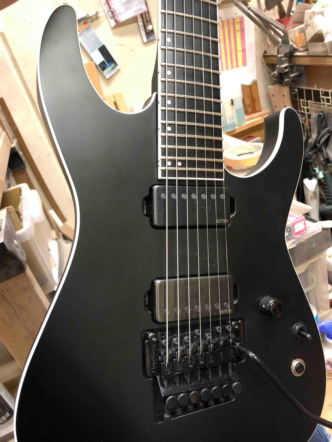 Acquired: 2017Notes: First 7-string guitar, stock model slightly modified. Pickup selector replaced with button switch and new selector installed. Button could be killswitch or possibly coil splitter. Photos of this guitar showed a glossy finish until TGS 2018, where it's been seen with a matte finish since. It's possible these are two different guitars, but more likely that the body was satinized.