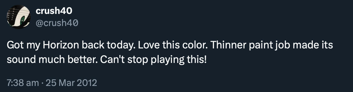 Acquired: late 1990sNotes: Limited-edition model from late 90s. #028/100. Possibly used for "With Me" because the solo requires 24 frets and a floating bridge, though that may have also been recorded on the Horizon-CTM. The possibility exists that the solo could have been played in a higher tuning on a 22-fret guitar, but since the guitar isn't well-intonated in the recording, I'm inclined to believe his Eclipse or Horizon was temporarily tuned down without a setup.Additionally, Senoue mentions using EMG 81 pickups at some point on "Thrill of the Feel". This would've been only one of two guitars he was likely to have owned at the time with those pickups.