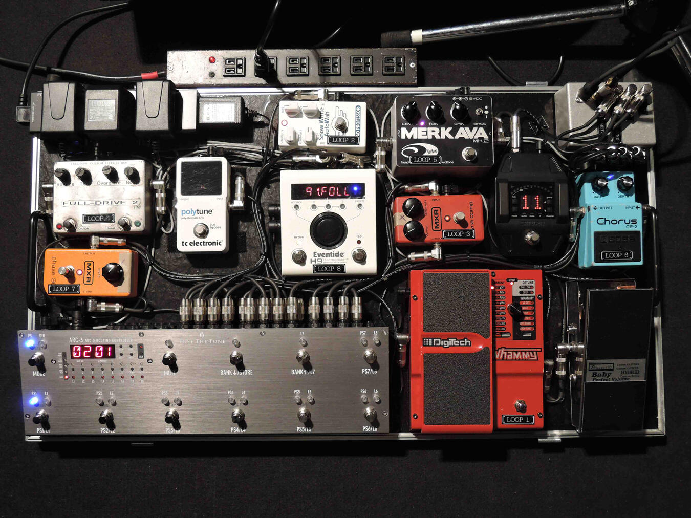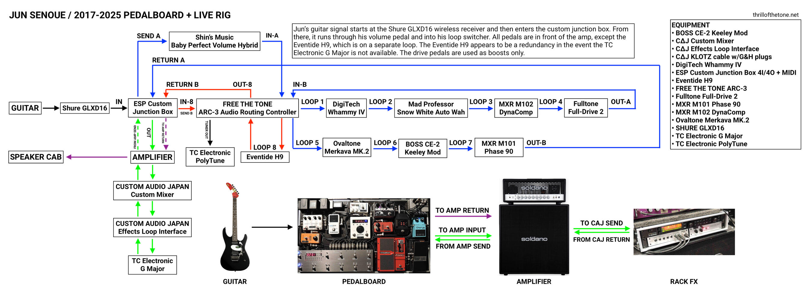 Senoue typically records plugged straight into his amplifiers, without using any pedals. But when he eventually did have a pedalboard constructed in 2017, he opted for a true bypass switching unit by FREE THE TONE, which utilizes a unique buffer design that bolsters the guitar's signal strength while minimising its coloration, protecting the signal from interference while ensuring the natural tone of the guitar is kept intact.While it's only an inference, an examination of Senoue's equipment paired with the culture of his musical upbringing suggests that he values the "natural tone of the instrument" and prioritizes it where possible.In practice, this means he keeps his setup as simple as possible, and in many cases that means plugging the guitar directly into the amplifier with a high-quality, low-capacitance cable. Even in his large 16U multi-FX rack from the late 90s, he made use of a high-quality true bypass switching unit to remove anything from the signal that wasn't currently being used.Someone once asked Senoue on Twitter how he gets his "sound". His response was "Well-maintained guitar, wonderful amps, good cables & mics."