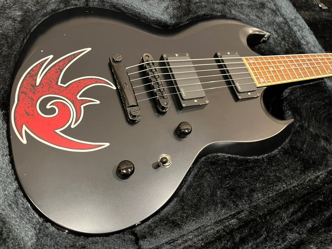 Acquired: 1987Notes: Actually a budget-level George Lynch signature model (SGL) that was later customized. Signed by Lynch in 1991 and largely left unused until 1998 when it was modified and repainted for the Sonic Adventure unveiling at Tokyo International Forum. Original pickups were LH-200 and Power Rail, now Seymour Duncan TB-4 and Schecter Monstertone. A replica was made in 2011 (ESP STH-130) and sold in limited quantities as Senoue's own first signature guitar model...