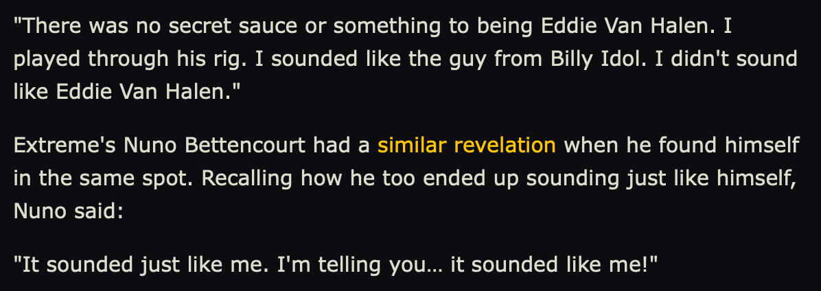 It has to be said that even if you were to play through Senoue's own rig with his own guitars, you wouldn't be able to sound exactly like him. Steve Stevens and Nuno Bettencourt talked about their experiences playing through Eddie Van Halen's own equipment.